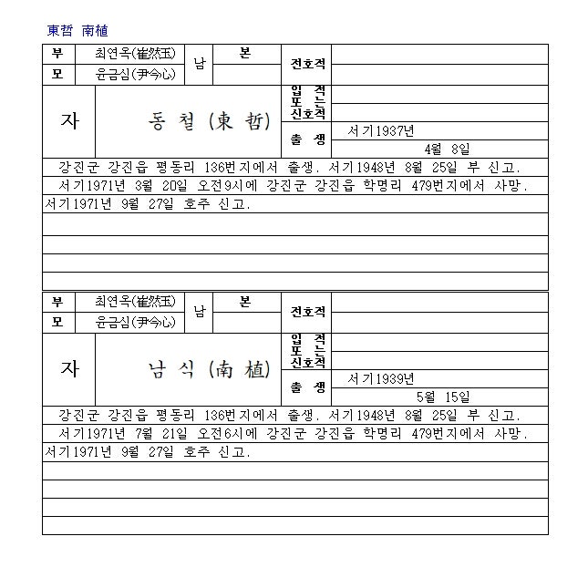 제적등본 한문 해석 부탁드립니다. 제적등본을 보는데 한자를 모르겠습니다.해석 부탁드립니다.감사합니다